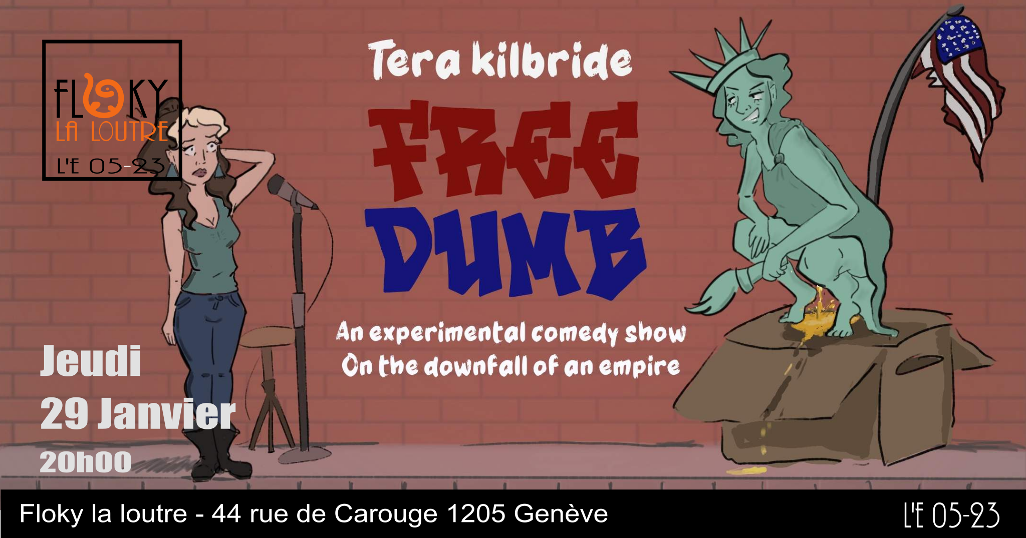 Floky la loutre 44 rue de Carouge, Genève“An American abroad, watching it all burn—through experimental comedy.” Tera moved from the USA to Berlin 6 years ago. Now her country is collapsing. After 6 years of performing stand up in Europe, Tera returns to her performance art roots…