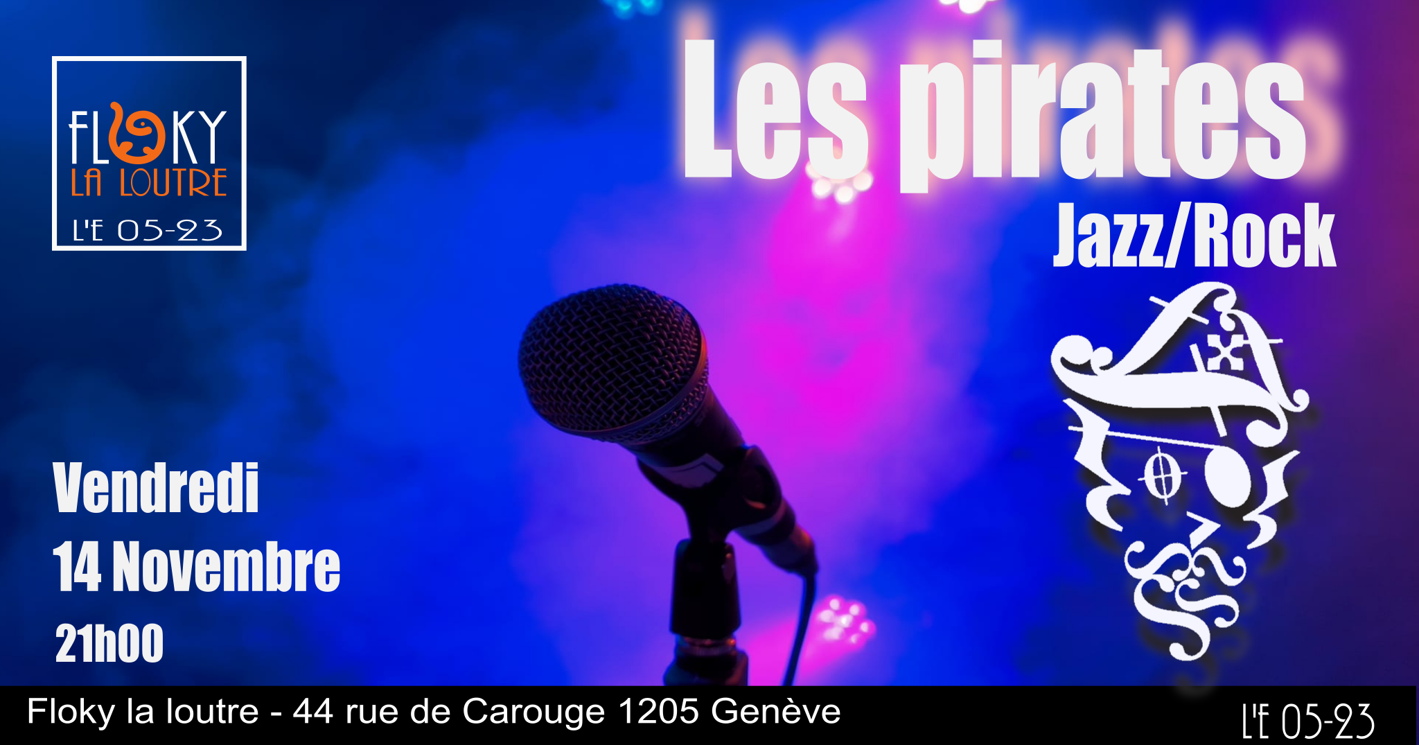 Floky la loutre 44 rue de Carouge, GenèveLes Pirates Floky est fier d'accueillir les Pirates pour un concert de Jazz/rock d'anthologie quasiment unique. Entrée libre, paiement au chapeau.