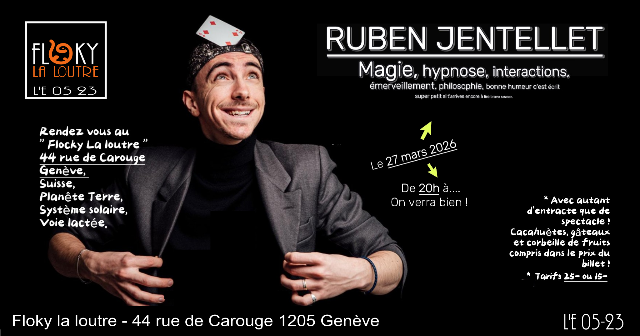 Floky la loutre 44 rue de Carouge, GenèveRuben Jentellet Magie, Hypnose, Interactions,... Ça va être un spectacle cool, vous devriez venir
